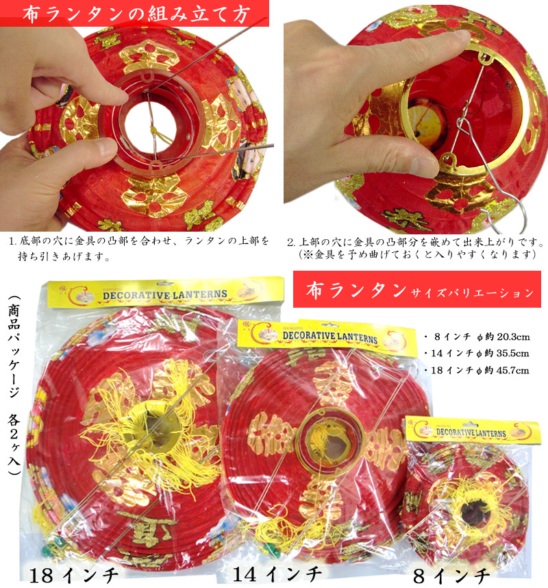 各種 布製ランタン![]() もっともシンプルでお手軽な布製のランタンです。【唐子】や【獅子】、【双龍】など、中国風のデザインのものが人気です。店舗装飾や催事の飾りつけなどに使用されます。通常、建物や部屋の出入り口などに左右に一対で飾ります。大・中・小とサイズがございます。 |