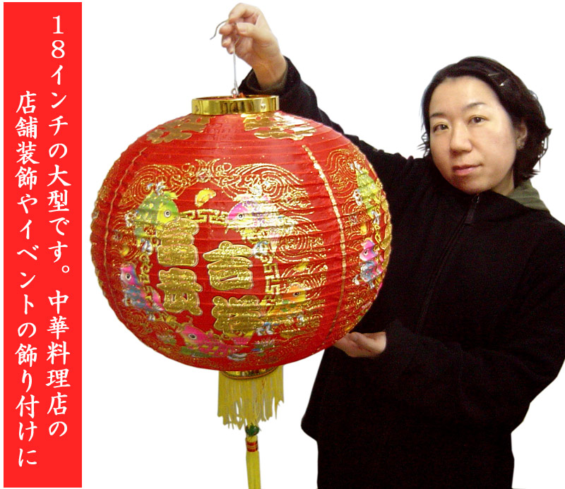 布紅灯(ランタン)五魚旺福18インチお目出度い魚が描かれた吉祥のランタンです ランタンとは中国風の提灯のことです。もともとは照明器具でしたが、現在では中国のイメージがあると言うので、店舗装飾や催事の飾りつけなどに良く使用されます。建物や部屋の出入り口などに基本的には左右に一対で飾ります。本商品は五匹の魚が描く吉祥のデザインがモチーフの18インチの大型布製ランタンです。中国では魚(鯉が用いられることが多い)は同じ発音の「余る=富裕」につながり、吉祥のモチーフとして様々なデザインに用いられています。中華料理店など店舗装飾や、ドラマや舞台の小道具、イベントの飾りなどにご使用下さい。