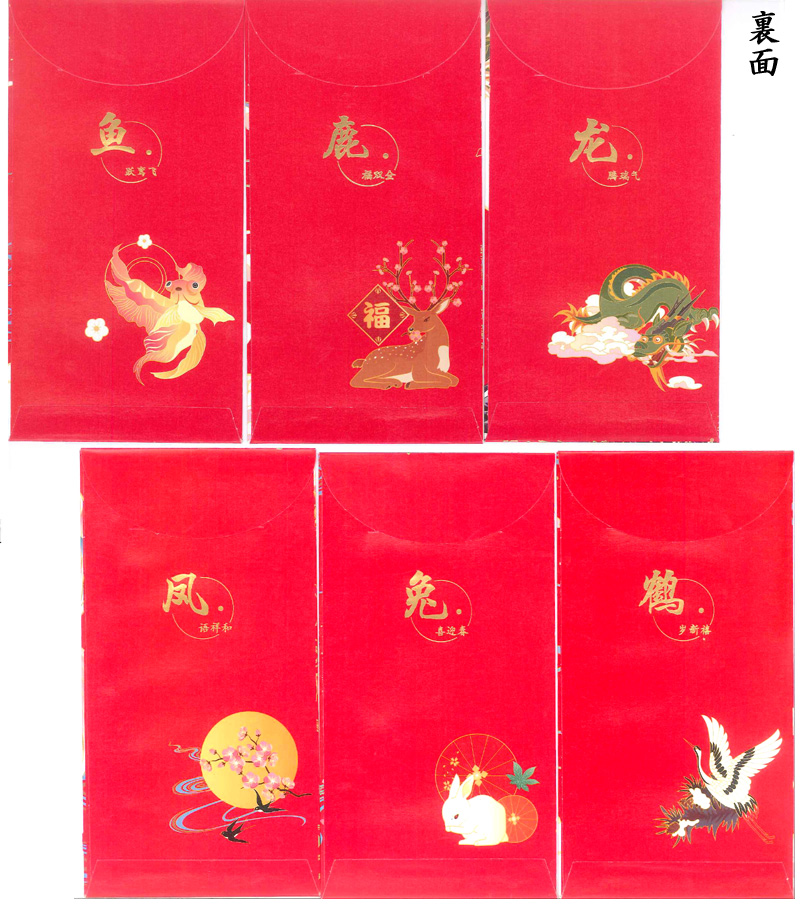 紅包(ホンバオ)は、中国で使われる紅いご祝儀袋のことです。お年玉だけでなく、結婚式やおめでたい宴会のとき、また子供にお小遣いをあげるさいなどに使われます。本商品はおめでたいイメージの魚や鳳凰などの動物をモチーフにした紅包です。厚手のしっかりとした紙質で、ご祝儀、入学祝、就職祝いなど色々な用途でご利用頂けます。6種類が各2枚ずつ12枚入ったBOXセットです。