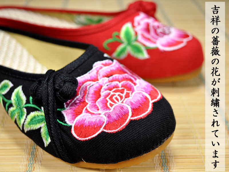 刺繍サンダル(薔薇)吉祥の【バラ】が刺繍された布製のサンダルです 吉祥の花である薔薇が刺繍された中国刺繍サンダルです。普段履きにしても履きごこち抜群です。靴底は中国で一般に牛筋底と呼ばれる軽くて丈夫なTPR樹脂を使用しています。これからの季節に涼しげな足元を演出します!