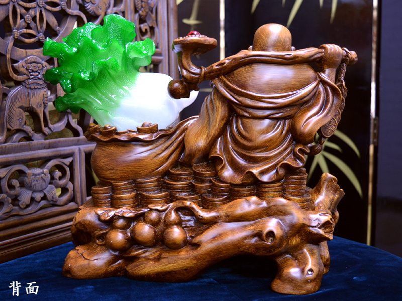 布袋(ほてい)は唐代に実際に存在したと言われる佛僧で、さまざまな伝説を残し、後代弥勒菩薩の化身と言われるようになりました。そのため中国では布袋を弥勒と呼ぶことがあります。本商品は大変おめでたいデザインの布袋の置物です。沢山の古銭や元寶の上に乗り、布袋様の代名詞、大きな堪忍袋の上には長寿のシンボル白菜が乗っています。肩には魔除けの瓢箪や願いが叶う如意、招財の古銭を担ぎ、これでもかと言うほどおめでたいシンボル満載の置物です。中華料理店や商店、オフィスなどに商売繁盛のインテリアとして人気がございます。