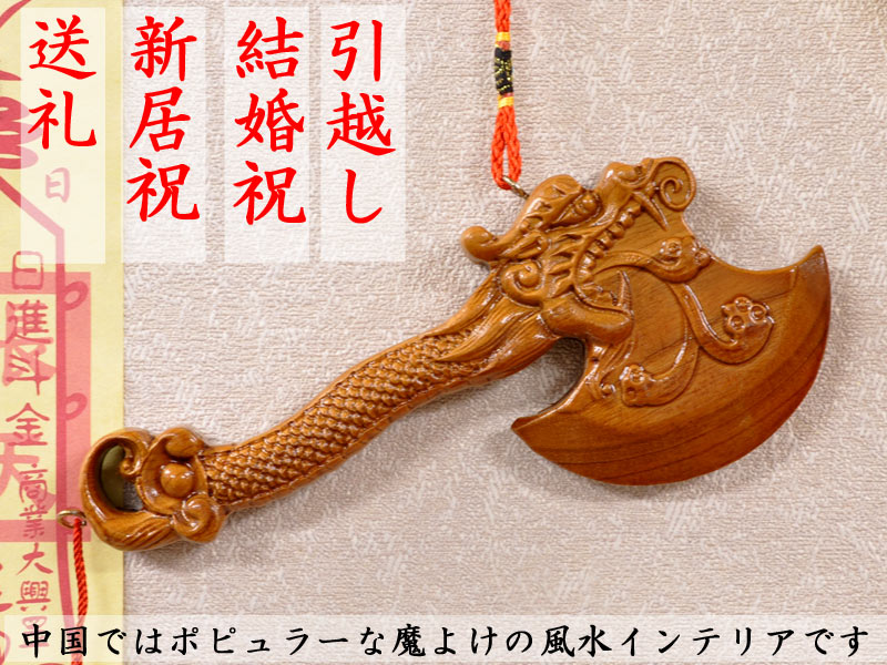 本商品はその桃木で作られた龍頭斧です。斧は読みが【福】と同じなので福を送るという意味で贈り物に使用されます。引っ越しや結婚、新居などに飾る魔除け・鎮宅のインテリアとして中国では大変ポピュラーな商品です。オフィスや中華料理店などのインテリアにも!